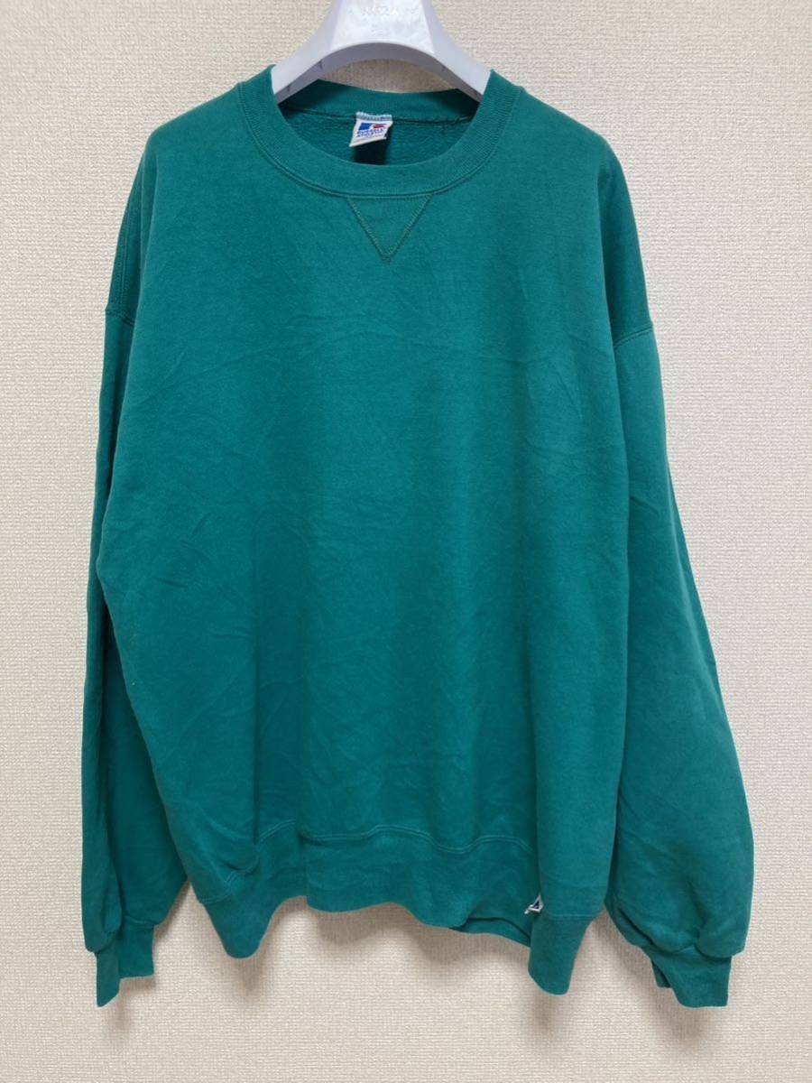 - 90's USAヴィンテージ RUSSELL ATHLETIC ラッセル アスレチック 前V スウェットトレーナー 緑 無地 USA製 XL グリーン 90年代