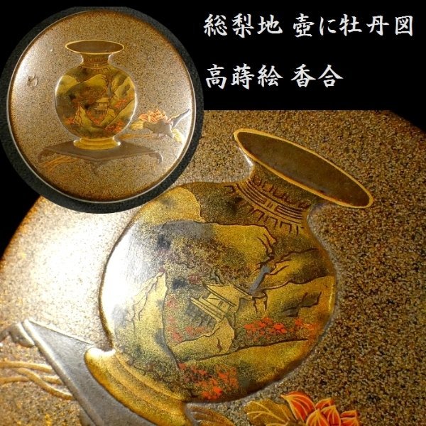 【 恵 #0670】 総梨地 壺に牡丹図 高蒔絵 香合 保管箱あり 検:漆器/漆芸品/香道/茶器/茶道/茶道具拍卖