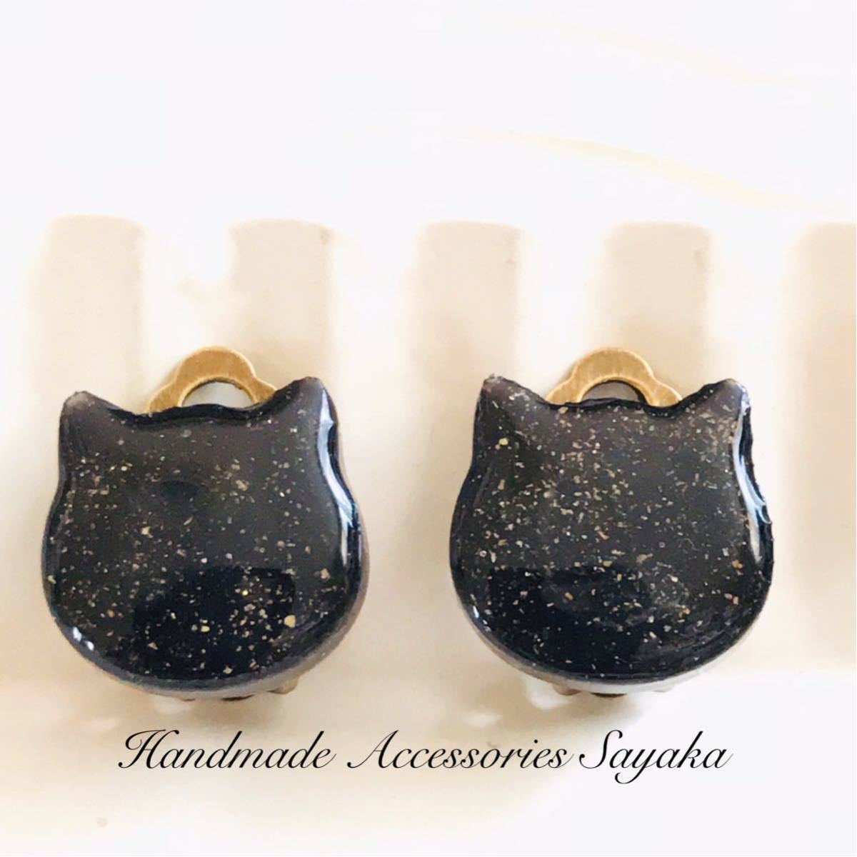 > 新品即決◆ハンドメイド イヤリング レジン キラキラ アクセサリー 黒猫 ねこ ネコ 金古美 手作り アニマル 動物 ブラック