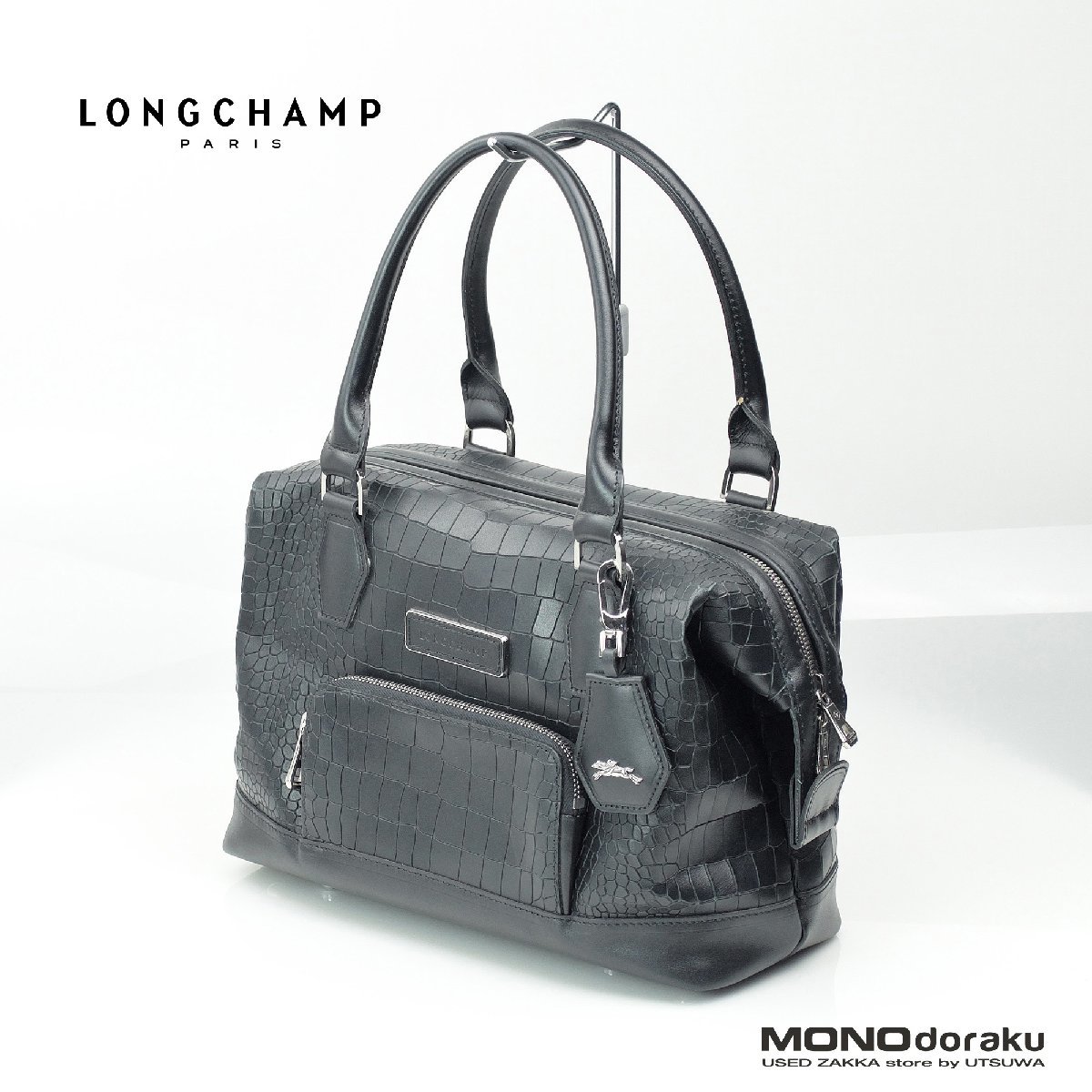 - ロンシャン LONG CHAMP ハンドバッグ ミニボストンバッグ フルグレインレザー クロコ型押し ブラック 美品