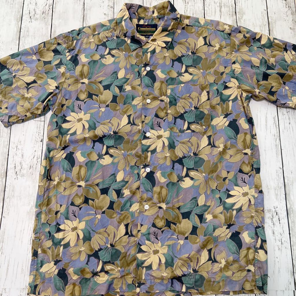 > 90s 日本製 Comfotton 開襟 オープンカラー 総柄 柄シャツ 花柄 リーフ レトロ アート ビンテージ 半袖シャツ