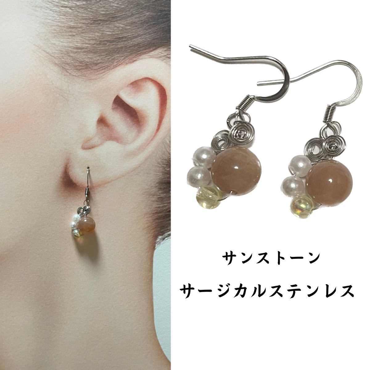 - 定136. サンストーン オリジナル 天然石 ピアス サージカルステンレス アレルギーフリー ニッケルフリー ハンドメイド