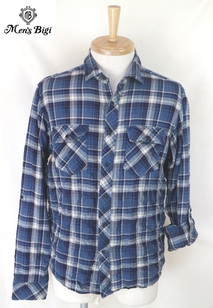 > ■超美品■Men's Bigi■薄手のネルシャツ風 ヴィンテージシワ加工 長袖シャツ M 02 ネイビーブルー系チェック メンズビギ
