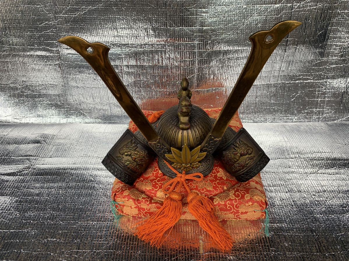 - ☆昭和 当時物 源九郎義経 長鍬形獅子頭の兜 源氏兜 兜飾り 鋳物 武具 オブジェ アンティーク レトロ 座布団付き 骨董 Used☆