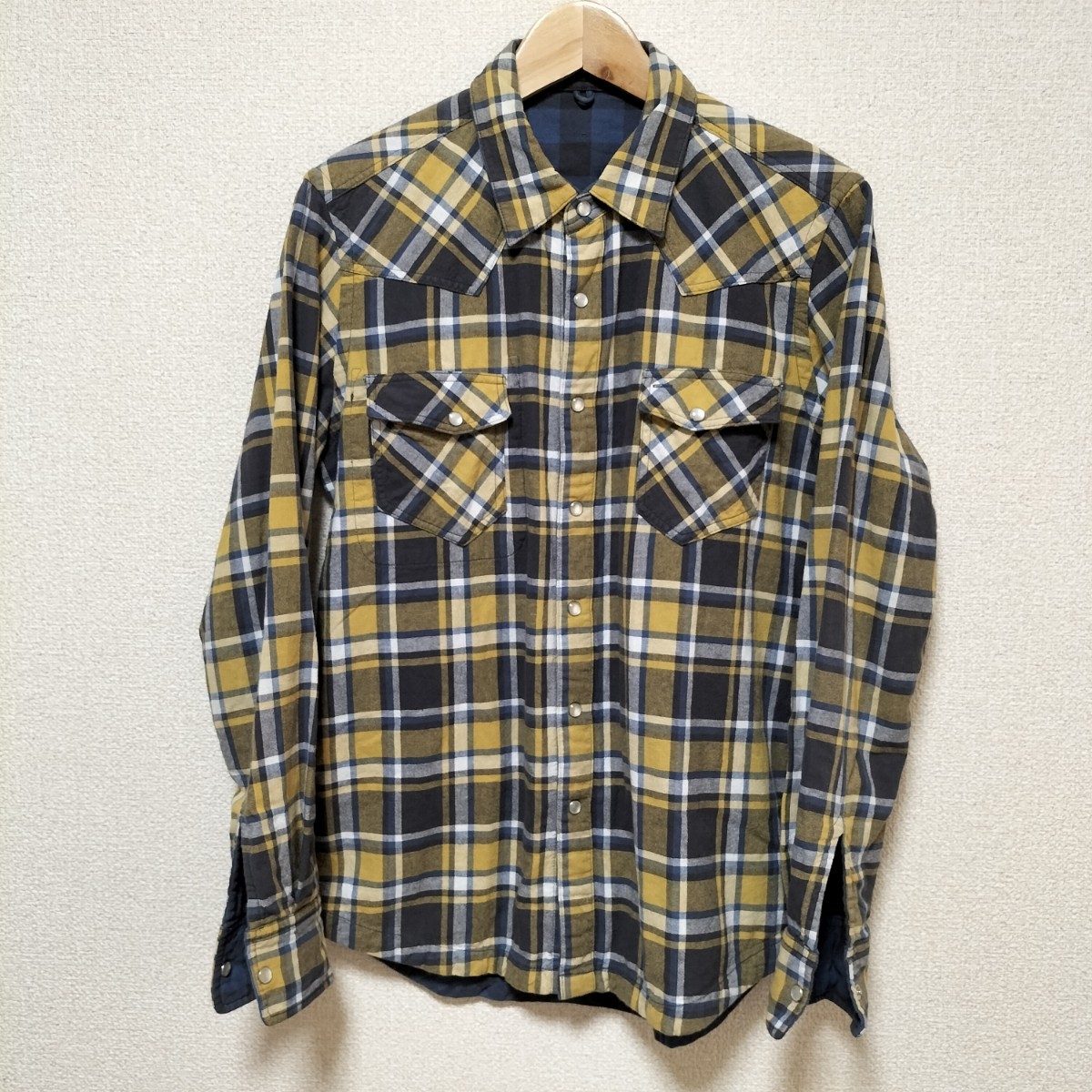 - ☆BEAMS HEART リバーシブル コットン シャツ ジャケット チェック イエロー ブルー サイズF 厚め 長袖 ビームスハート ブランド古着 USED