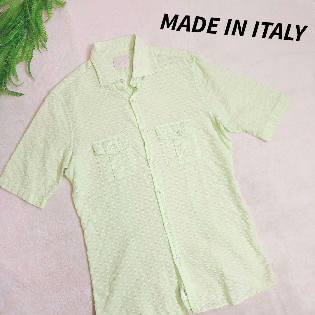 - イタリア製 やわらかコットン素材・半袖シャツ・淡いライトグリーン黄緑 Mサイズ 81056