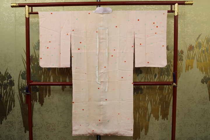 > きもの今昔5860 長襦袢 広衿袷手縫い仕立て 正絹綸子地菊地紋に絞り染入り 胴裏に酸化汚れ有り 身丈122cm