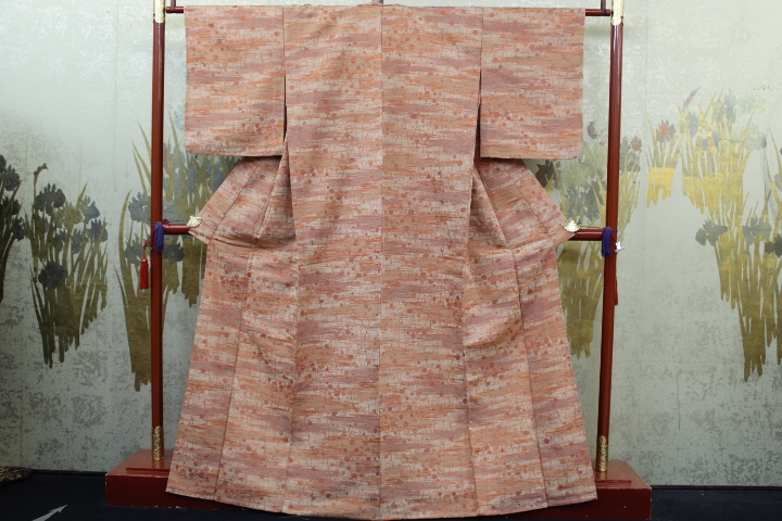 > きもの今昔5887 単衣のきもの バチ衿セブセ付き 正絹御召地単衣きもの 煉瓦色横霞柄織 身丈162cm
