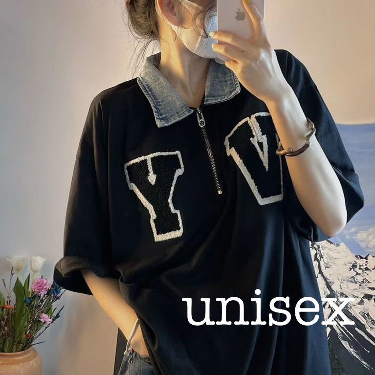 - ポロシャツ ビッグシルエット 半袖 トップス カットソー ジップ シャツ レディース メンズ 襟付き デニム生地 ユニセックス 男女 L