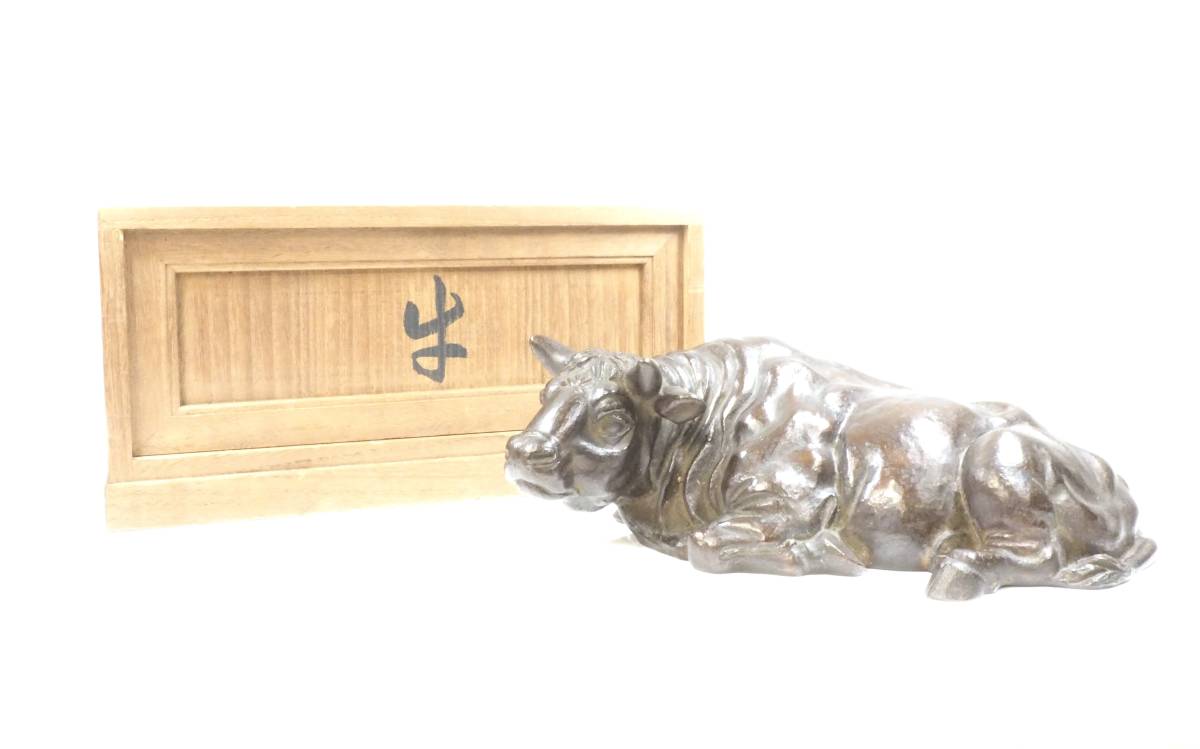 - 昭和ビンテージ 彫刻家 元日展理事 分部順治作『牛』在銘品 ブロンズ像 鋳銅 銅像 オブジェ 置物 金属工芸 共箱 TNI510