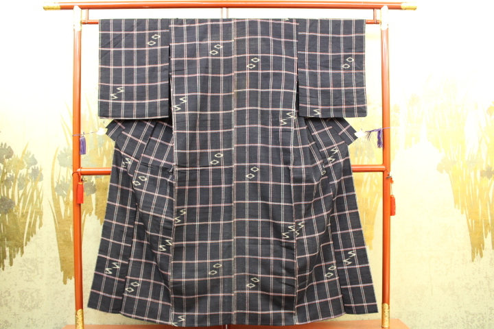 > きもの今昔5924 単衣のきもの バチ衿手縫い単衣仕立て 正絹紬ヨコに節糸の強い糸大格子に絣入り 身丈147cm