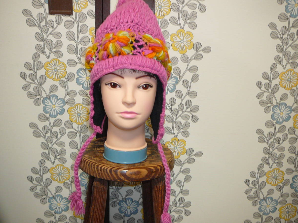> 新品未使用 POWDER LAND ビーニー ニット帽 ウール ハンドメイド 内総フリース地 ピンク 花モチーフ ネパール製