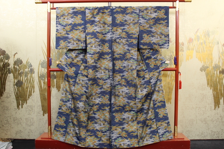 > きもの今昔5965 紬のきもの 広衿袷手縫い仕立て 十日町製大島調絣 シミ汚れ問題なし 未使用に近い 159cm