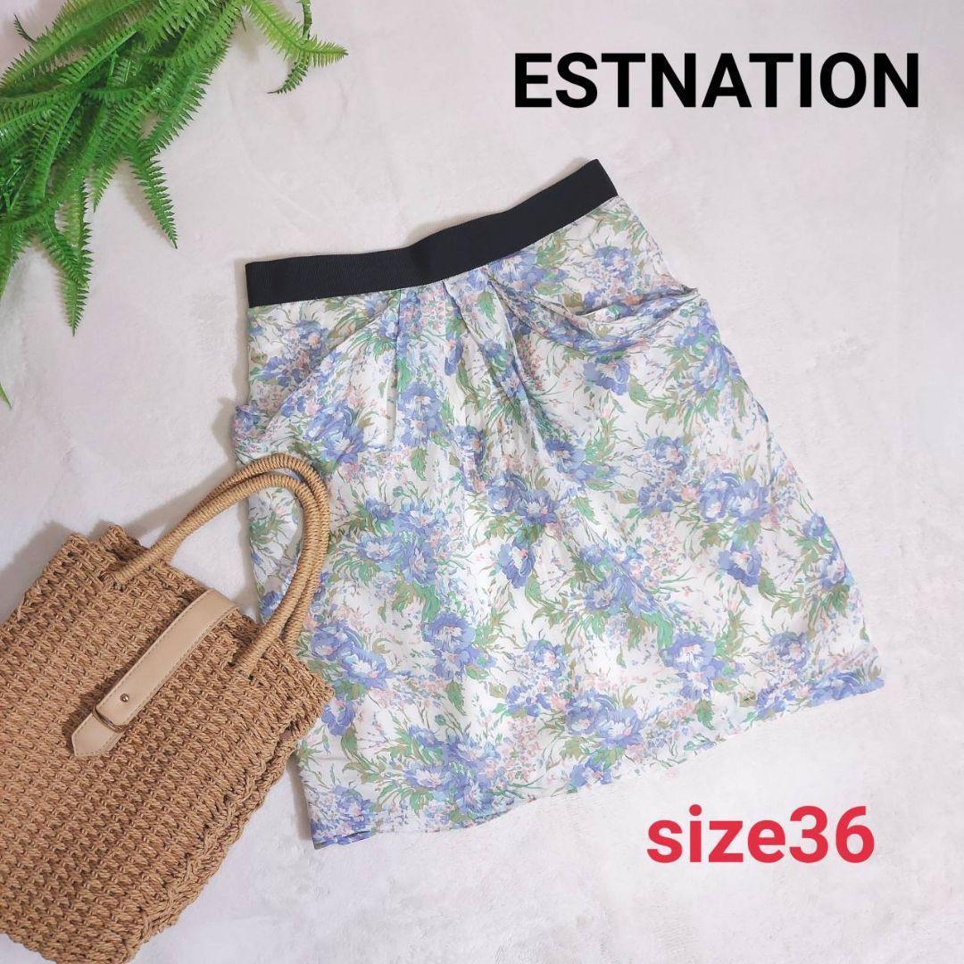 - ESTNATION ボタニカル・花柄 スカート膝上 表記サイズ36 S オフホワイト&紫がかった青&水色&緑グリーン 総柄 台形 66218