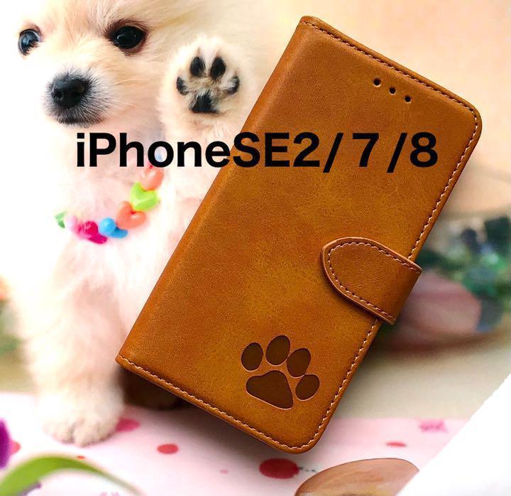 > 【iphoneSE2/7/8】肉球刻印スムース加工レザー手帳型ケースキャメル新品