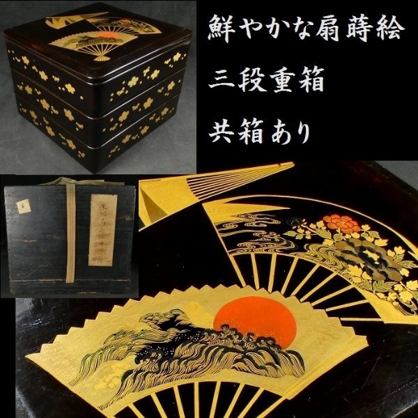 > 【 恵 #0855 】 内外に華やかな扇の金蒔絵が施された一品です 三段重箱 共箱あり 木製 黒塗 検:重箱/金蒔絵/茶道/草花文