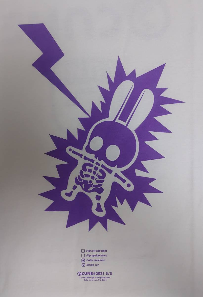 > 2021 特殊仕様 CUNE キューン『反転Tシャツ 感電』裏返し 丸首 半袖 白 前後左袖紫プリント L・身幅約54cm※未試着品/未使用品/タグ付き