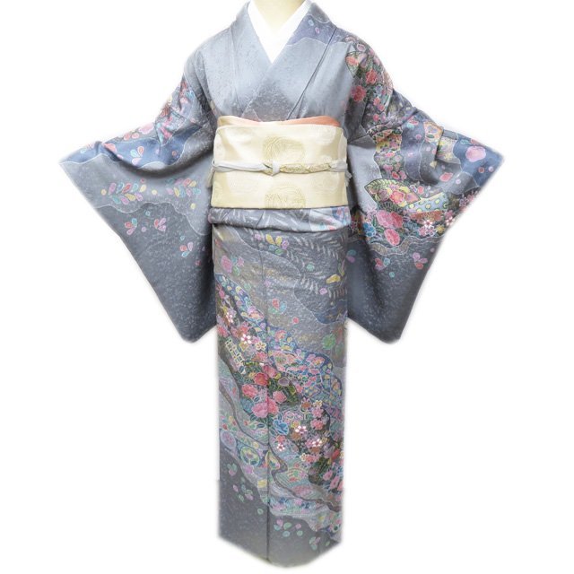 > 訪問着 着物 中古 正絹 袷 フォーマル 道長取り 花の図 地模様 鼠系色 多色 金 身丈162cm 裄68cm M きもの北條 A947-7