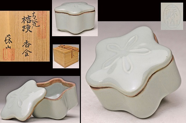 > 諏訪蘇山 初代 ★ 青磁 桔梗 香合 ★ 共箱 ★ 明治時代 帝室技芸員 ★ 南宋官窯を思わせる気品ある釉景と造形の逸品 ★ 香道具 茶道具 ★