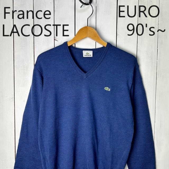 > ヨーロッパ古着 90s~ フランス企画 LACOSTE ハイゲージ ラムウールVネックニットセーター 3 青紺 オールド ラコステ ヴィンテージ ●219