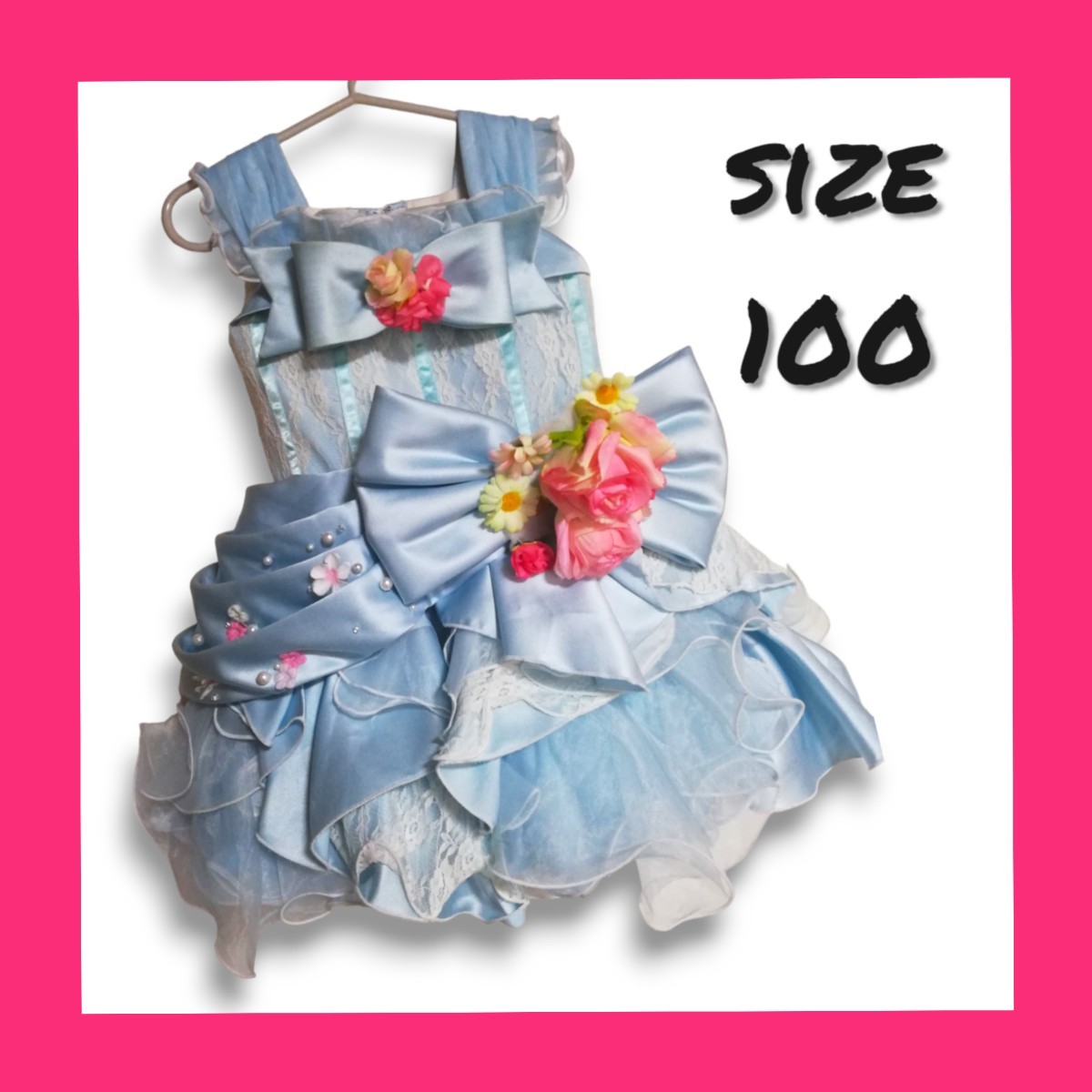- 【美品】キッズ ドレス 100cm ブルー 水色 花 レース ボリュームあり 子供ドレス 発表会 演奏会 パーディー フォーマルドレス プリンセス