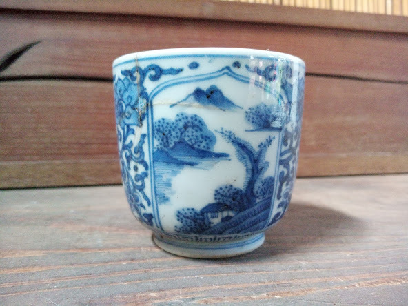 - ◇《旧家蔵出し》湯呑/太明成化年製 古食器 古皿 器 陶器 茶碗 和柄 風景画 染付 中国 レトロ アンティーク コレクター