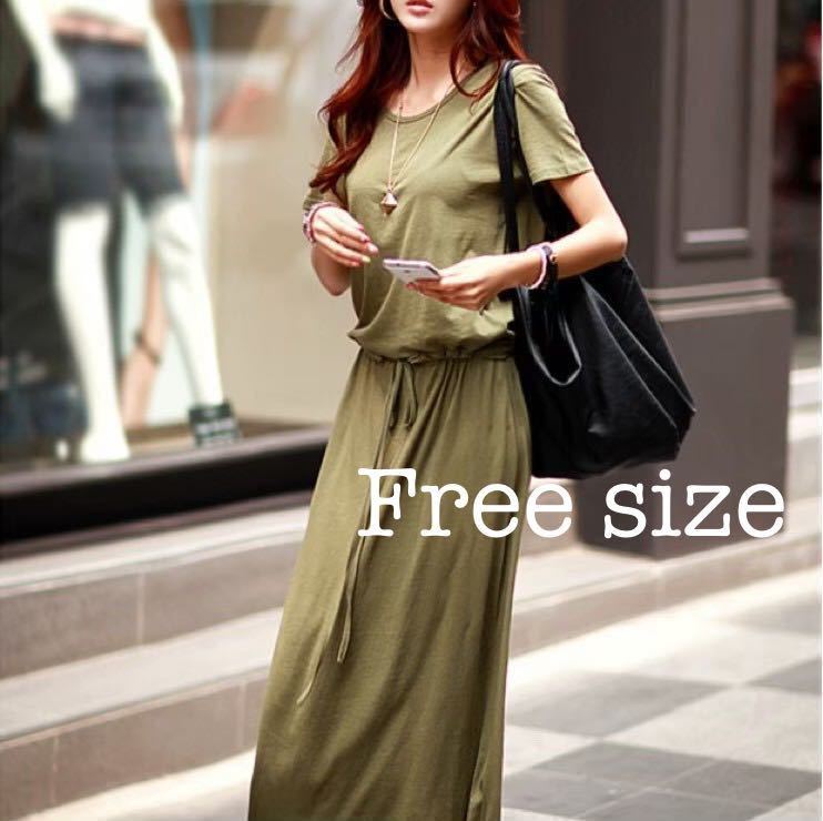 - マキシ丈ワンピース オールインワン 半袖 リゾート ワンピース カーキ 緑 グリーン フリーサイズ