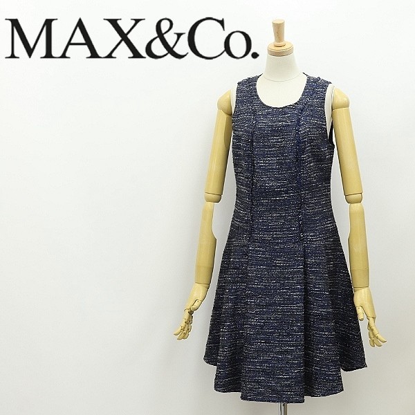 > ◆MAX&Co. マックスマーラ ラメ混 ツイード タック プリーツ ノースリーブ ワンピース 紺 ネイビー 40