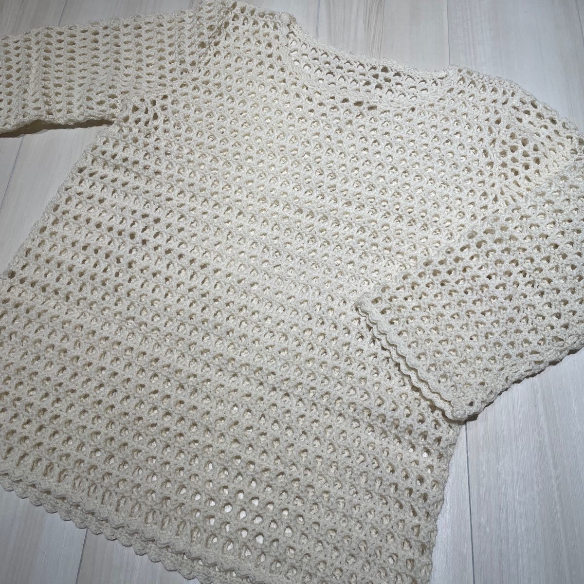 - ハンドメイド ニット 手編み 生成り セーター メッシュ 穴あけ 七分袖 レディース 重ね着 アイボリー系 Mくらい かぎ針 重ね着