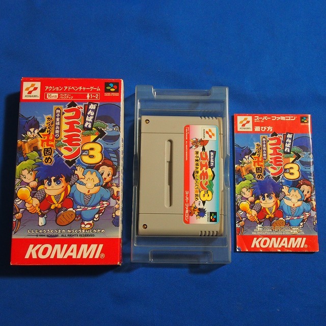 > 【整備済】送料込 SFC がんばれゴエモン3 獅子重禄兵衛の卍固め 箱説明書つき セーブ可 即決 スーパーファミコン