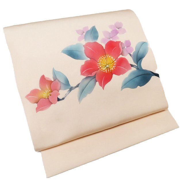 - 名古屋帯 なごや帯 中古 リサイクル 正絹 カジュアル 仕立て上がり 花の図 薄卵色 きもの北條 A954-9