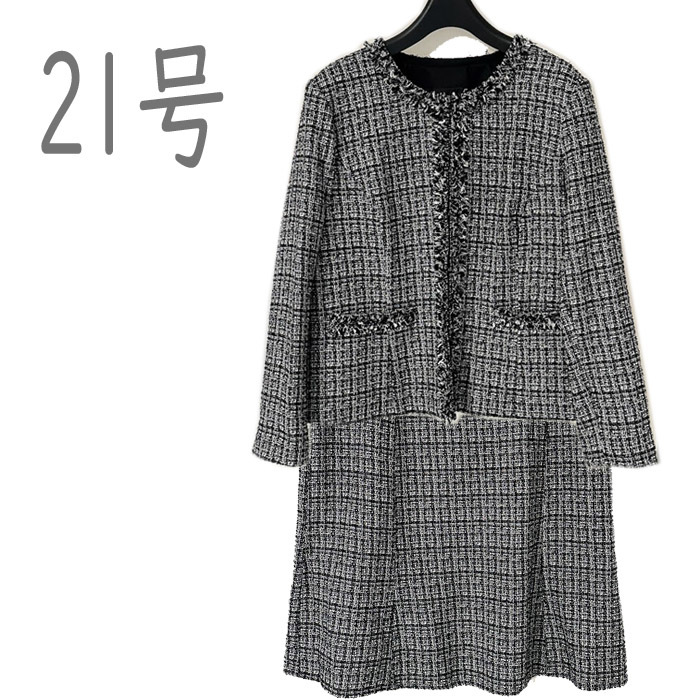 - ●新品/2点/スーツ/ノーカラージャケット/スカート/ツイード/黒系/21号/入学式/レディース●&0978