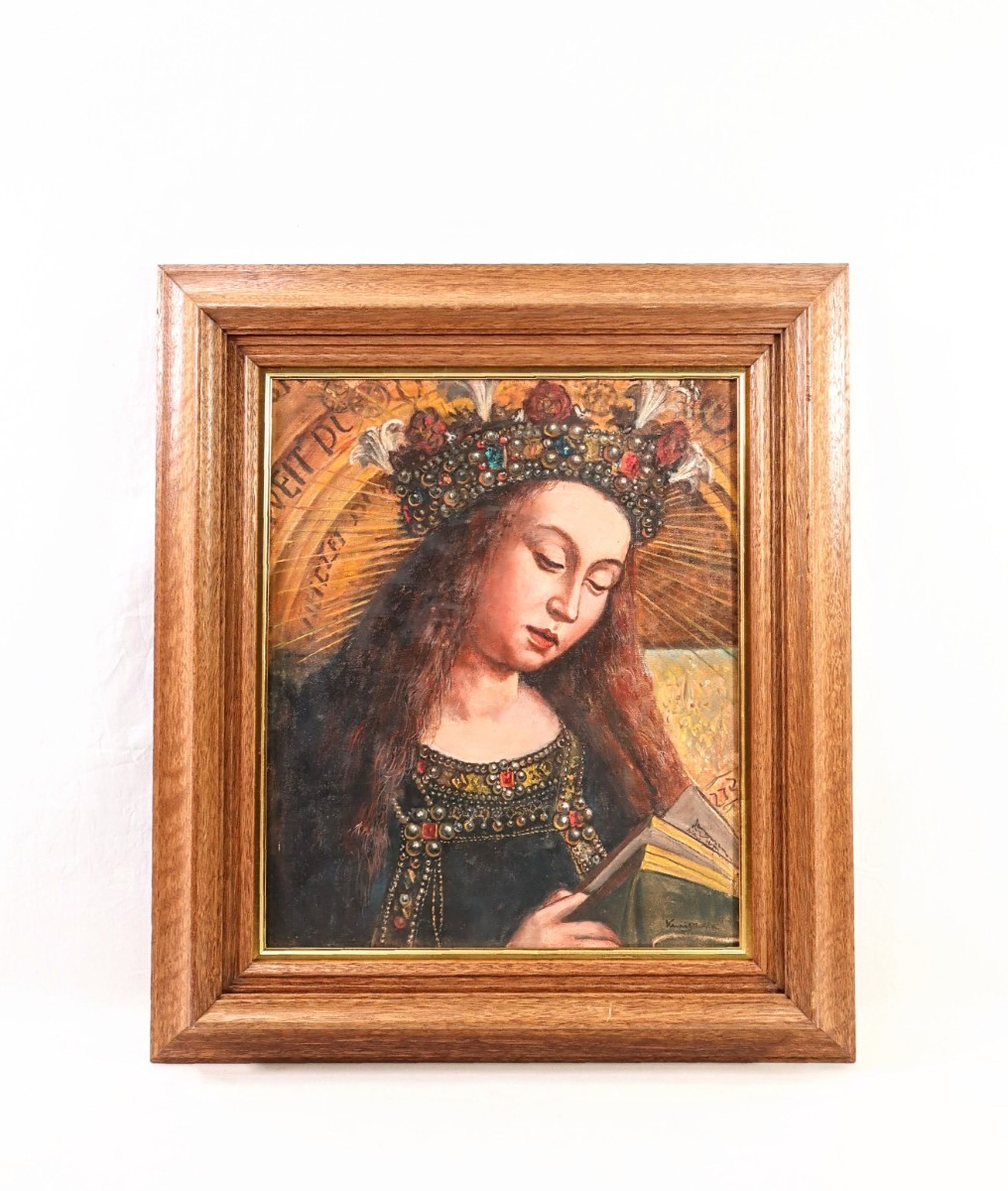 - 真作 国沢和衛 1957年油彩「聖母マリア」画 F8 山口県出身 猪熊弦一郎に師事 ヘントの祭壇画より ヤン・ファン・エイクへのオマージュ 8232