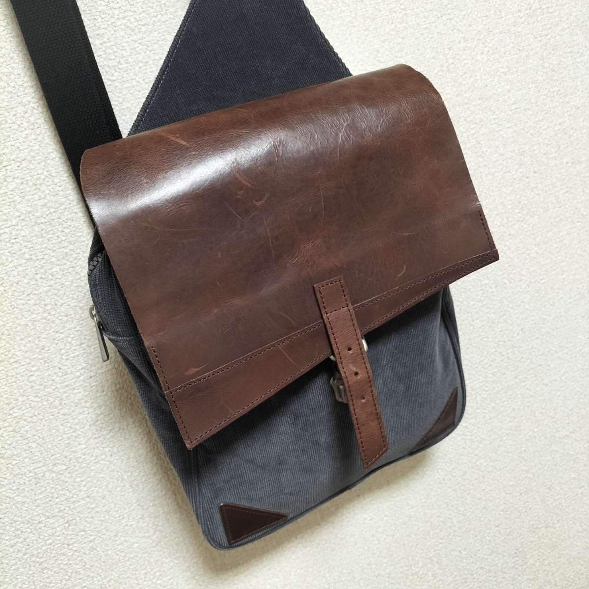 - ☆DOCHE ショルダー ボディバッグ 本革 レザー ブラウン コーデュロイ コーズ ネイビー 紺 差込バックル ジップ 鞄 ドーチェ 古着 USED