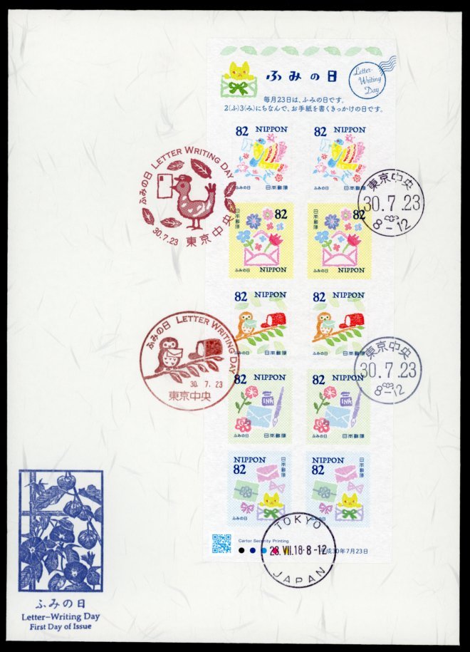 - z333 【FDC】2018 ふみの日(82円)[東京中央/30.7.23/鳴美版](解説書なし)
