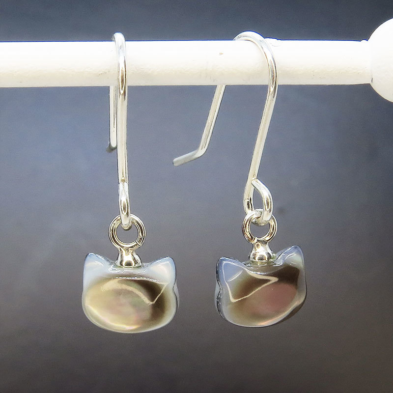 - シルバー925 猫モチーフ ブラックマザーオブパール 黒蝶貝(ブラックシェル)の猫ピアス フックピアス