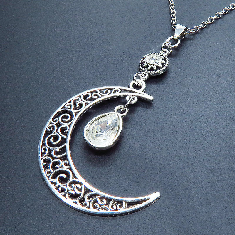 - アンティークシルバー アラベスク調の透かし模様の入った三日月にラインストーンのムーンネックレス 長さ調整可