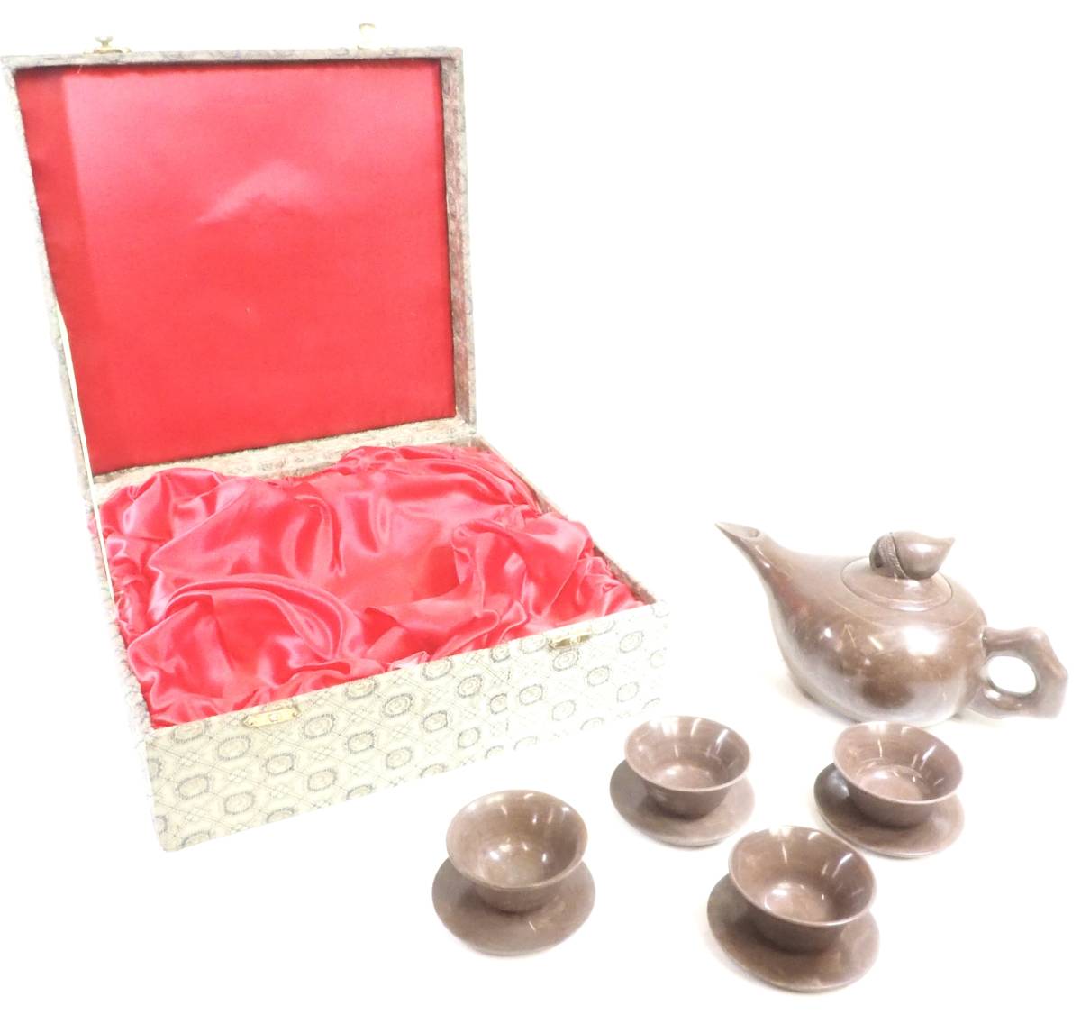 - 中国ビンテージ 中国健康工芸品 茶器 木魚石の急須と湯呑4客セット 手彫り 奇石 箱付き 1990年代 FEM512