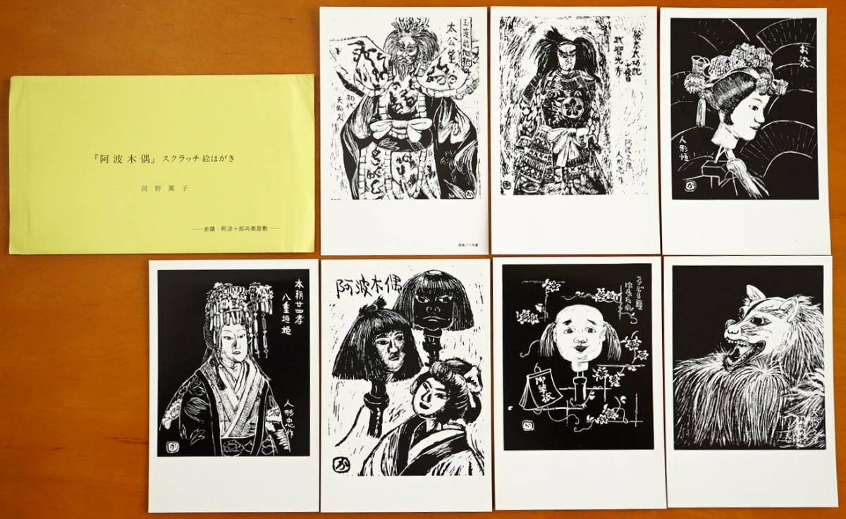 - 絵葉書 阿波木偶 スクラッチ絵はがき 岡野薫子 7枚 史蹟・阿波十郎兵衛屋敷発行 紙ケース付 検:徳島県徳島市川内町宮島本浦 人形浄瑠璃