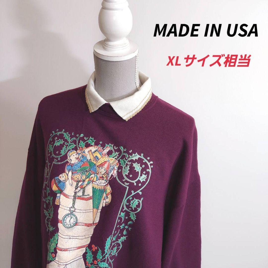 - USA製 童話メルヘン風プリント・裏起毛スウェット 襟付き XL相当 紫が強めのワインレッドドロップショルダー66755