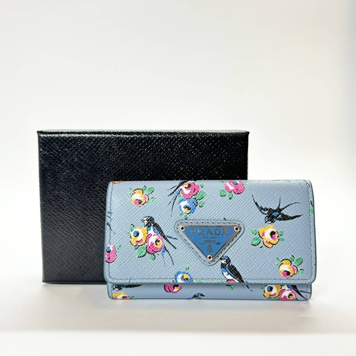 > 【中古美品】 PRADA プラダ キーリング付き 4連キーケース 花柄 鳥柄 サフィアーノレザー ブルー 1PG004