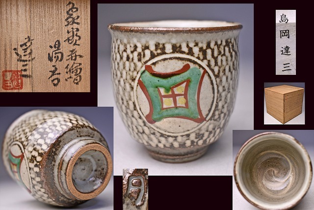 - 島岡達三 ★ 象嵌赤絵湯呑 ★ 共箱栞 ★ 益子焼 ★ 人間国宝 ★ 合田好道 風の色絵デザイン ★ カップ ★ shimaoka tatsuzou mingei 民芸