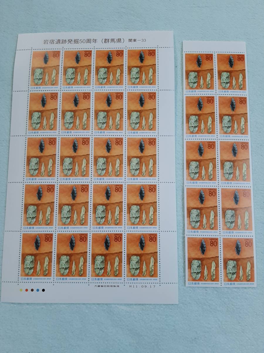 ふるさと切手 岩宿遺跡発掘50周年(群馬県)関東-33 H11 切手シート1枚と10枚シート