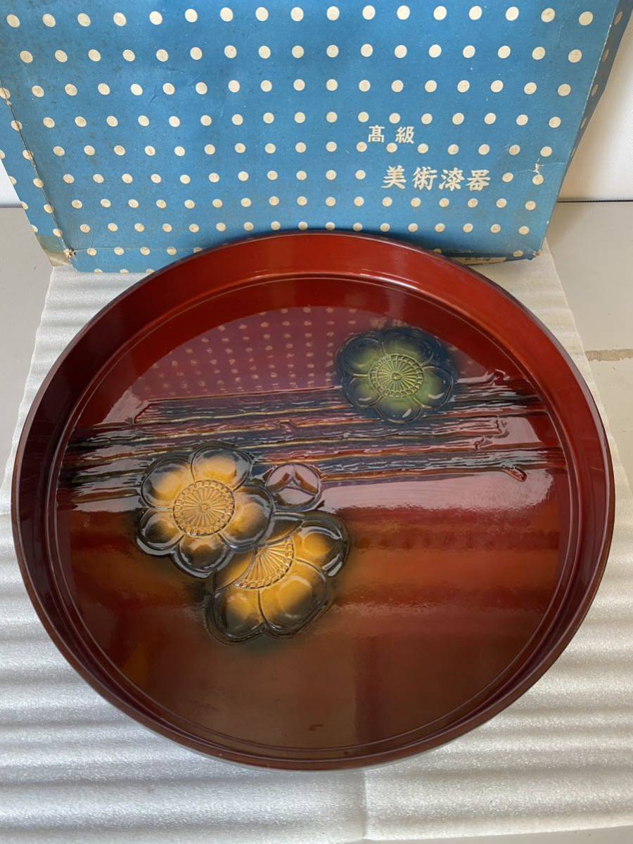 - 昭和レトロ 高級美術漆器 古木梅 丸盆 お盆 【未使用品】