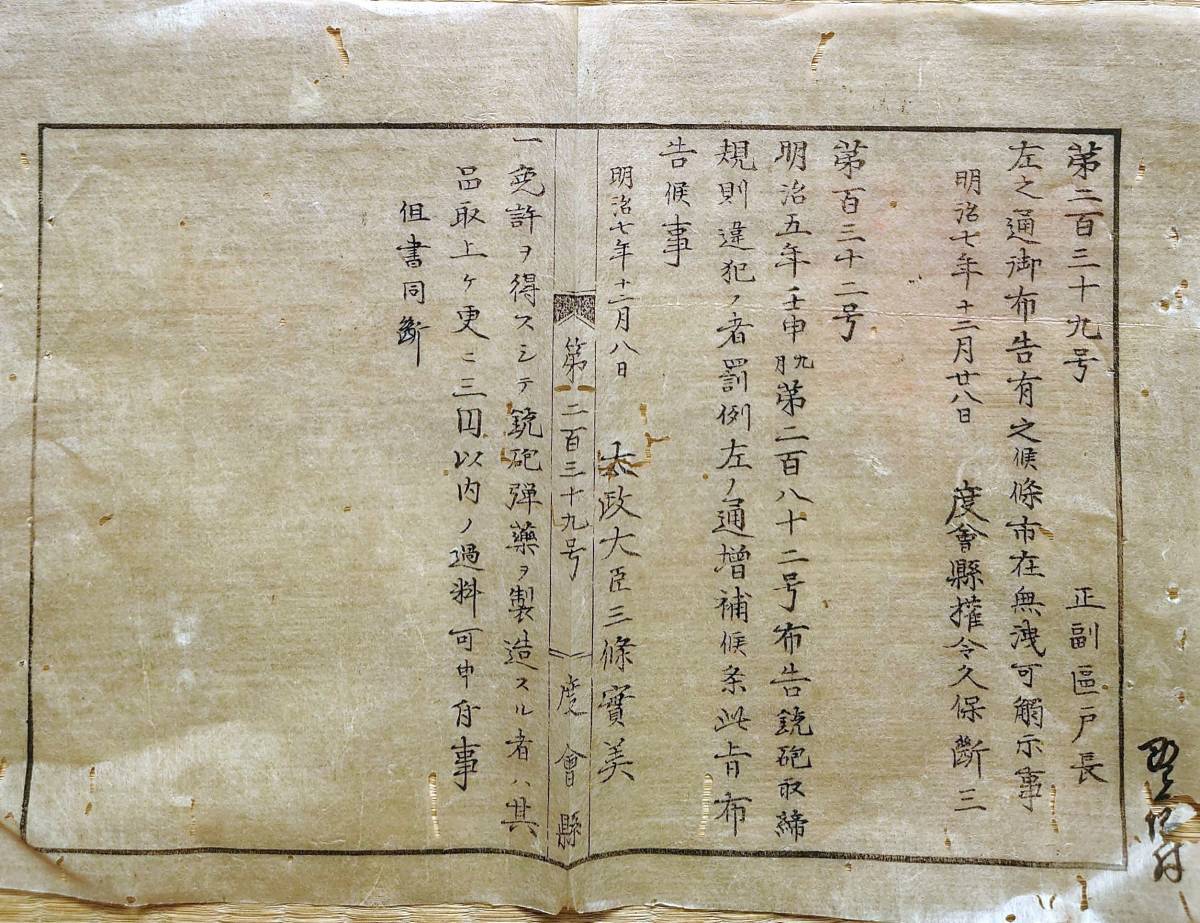 - f23030212〇明治布告布達 明治6年 銃砲取締規則違反の者 罰例増補 免許を得ずして銃砲爆薬を製造する者 度会県 三重県〇和本古書古文書