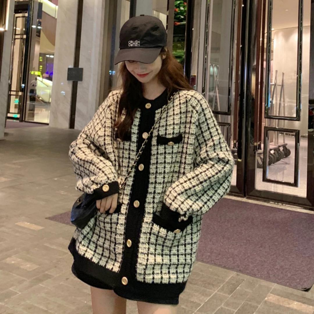 > F ツイードニットカーディガン ボレロ 長袖 チェック柄 厚手 フェミニン ナチュラル カジュアル こなれ感 ママ 黒 白 韓国 トレンド