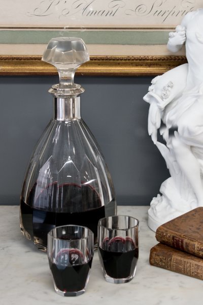 カラフェも同じく丁寧にカットされたボディに同じくクリスタルのキャップとシルバーの首がポイントになった、素敵なお品。