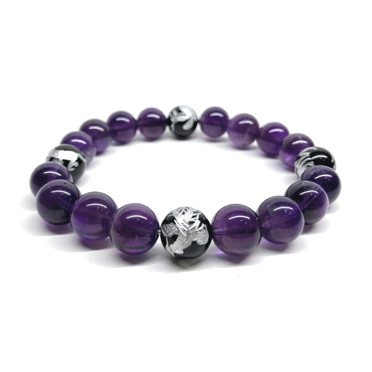- 10mm 四神獣銀彫オニキス×アメジスト パワーストーン ブレスレット天然石 運気上昇 開運 金運 恋愛運 お守り 青龍 白虎 玄武 朱雀