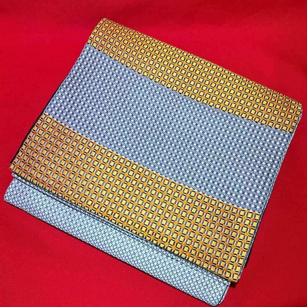> ☆美品☆袋帯 しゃれ袋帯 黒地 全通柄 ブラック×オレンジ 格子柄 和装小物 着物用 和服 レディース 女性 (02116並