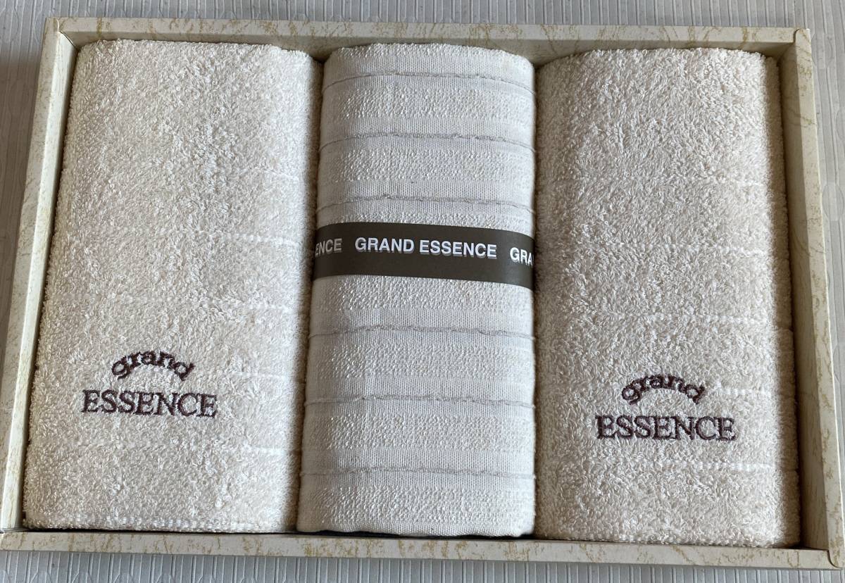 - フェイスタオル2枚 ボディタオル1枚 ESSENCE ベージュ系 抗菌防臭加工 天然素材 ギフト品でしっかり生地 日本製■■未使用品